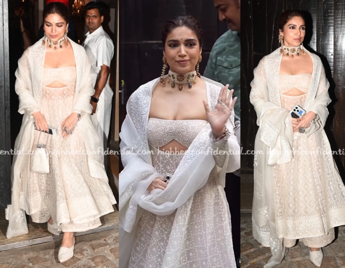 Bhumi attended Sonam’s baby shower on Sunday wearing a chikankari kurta set and while the chikankari work was exquisite, I didn’t care for the kurta’s strapless midriff peekaboo design. You like?
