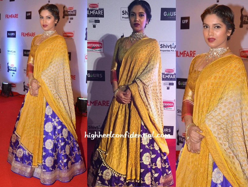 Bhumi threw us a curveball by going traditional in a Banarasi lehenga by Manish Malhotra. Aside from the Judith Leiber clutch, jewelry from Gehna and Anmol finished out the actor’s look.Like what you see?
