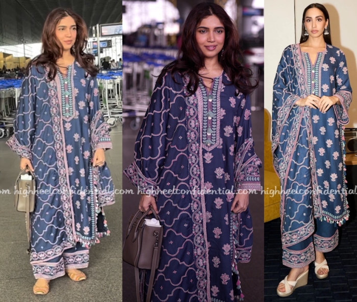 While travelling out of the city, Bhumi was seen wearing a blue kurta set from Mulmul paired with juttis and her Celine Nano bag. She looked nice in it suit. You like?