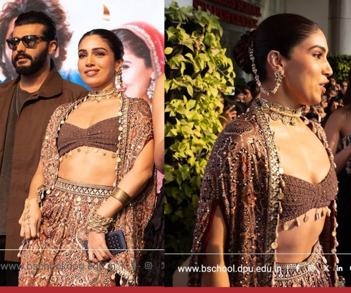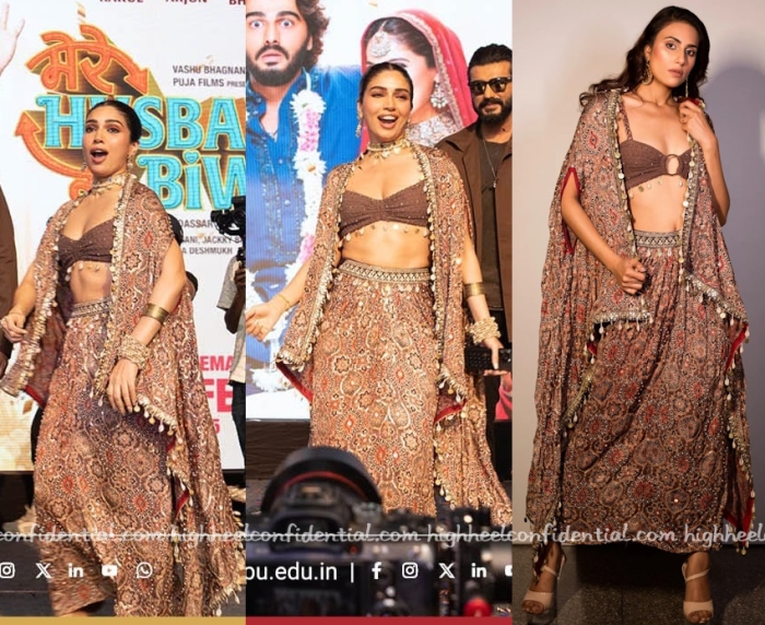 Bhumi attended promotions for her movie last week in Pune and was seen wearing a printed cape and skirt set from Nitya Bajaj featuring a crochet bralette. We all probably have midriff fatigue with her promotional looks but that aside, I quite liked this one on her.