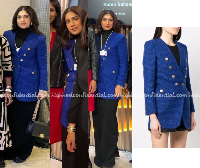 Bhumi, who is attending the annual World Economic Forum in Davos Switzerland, shared a few pics today and one of the days was spotted wearing a Saint Laurent tweed jacket with a black turtle neck and black pants. Love the jacket and hope to see it on her again.