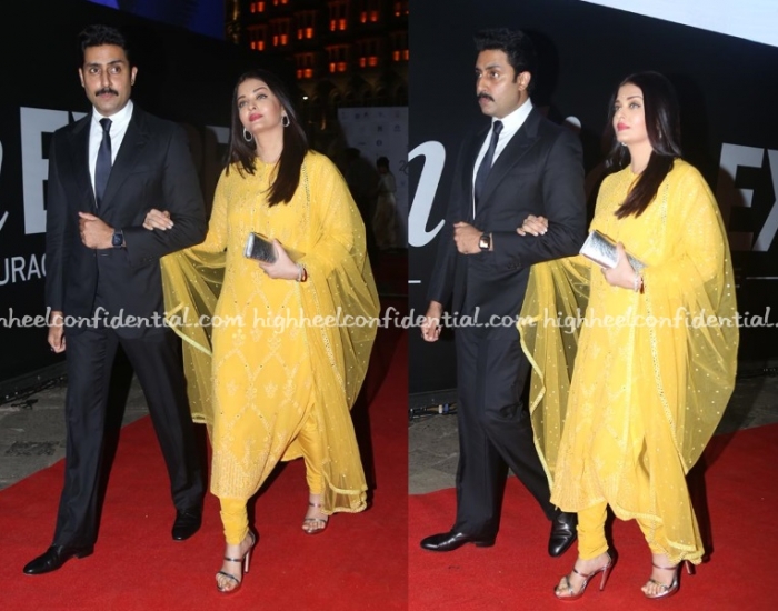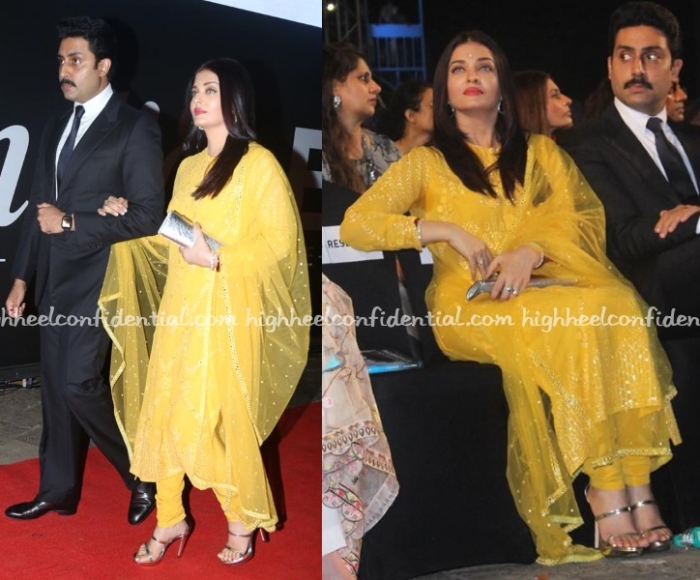 Aishwarya attended a tribute concert on Tuesday evening wearing a yellow straight-cut suit by Falguni and Shane Peacock. I am just glad she didn’t wear that siren red lipstick she normally has on this time. The muted shade worked well with the bright suit. She looked great.