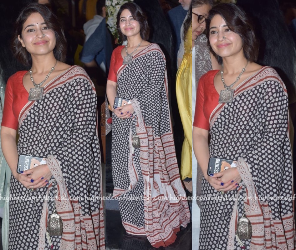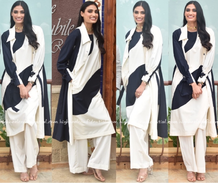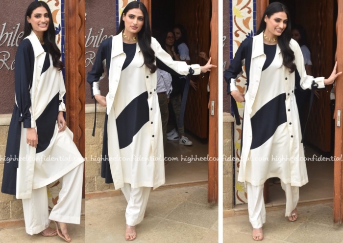 More recently, while in Delhi promoting her movie, she was photographed in a dress by MxS. A pair of metallic ankle-strap sandals rounded out this look of hers.