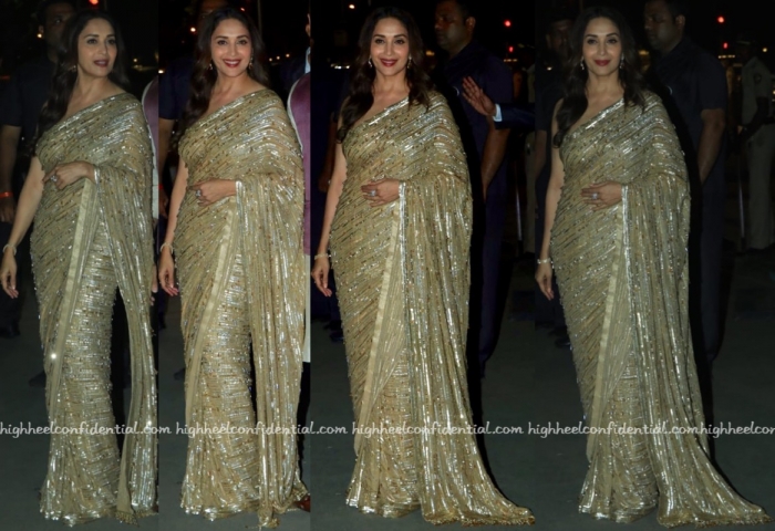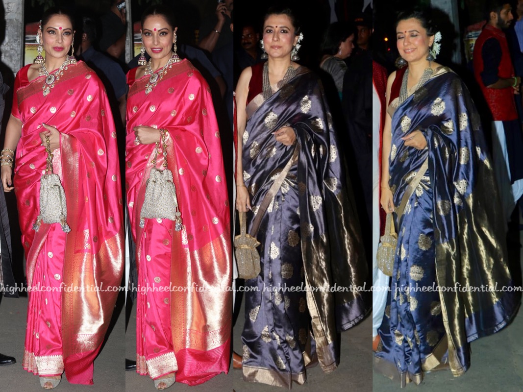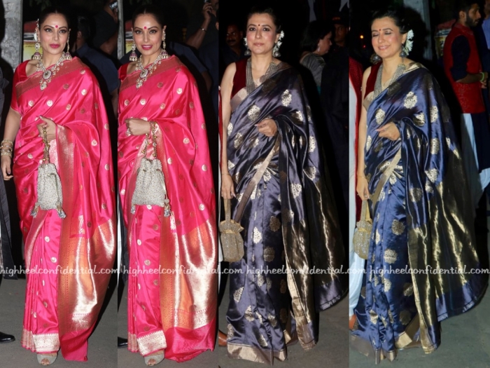 Wearing silk saris by Raw Mango, both Bipasha and Mini attended the soirée thrown by Bachchans last night. With flowers in their hair, the ladies rounded out their look with bindis, traditional jewelry and gold-toned potlis. They both looked lovely.