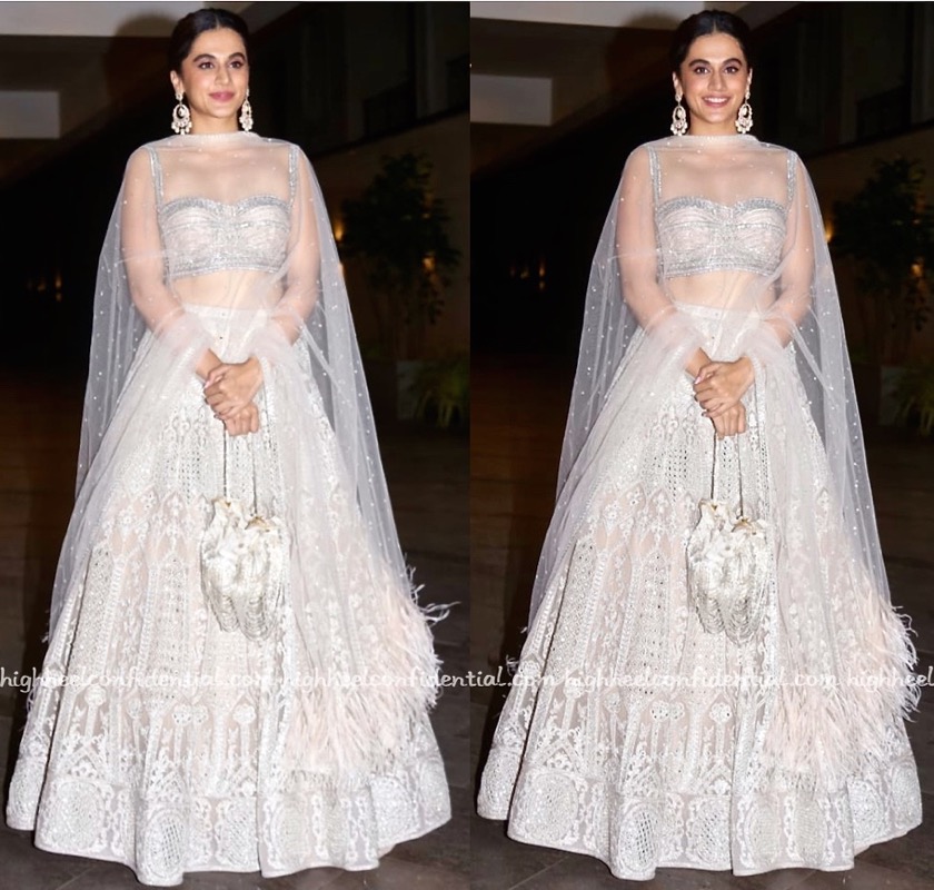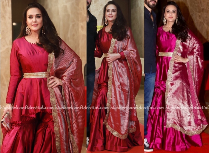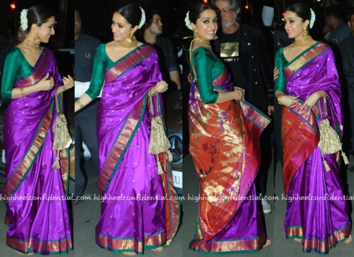 It was a paithani sari for Shraddha as she attended the Diwali party at the Bachchans’. Going for the classic, she rounded out her look with traditional gold jewelry and flowers in her hair. I wouldn’t change a thing; she looked lovely.