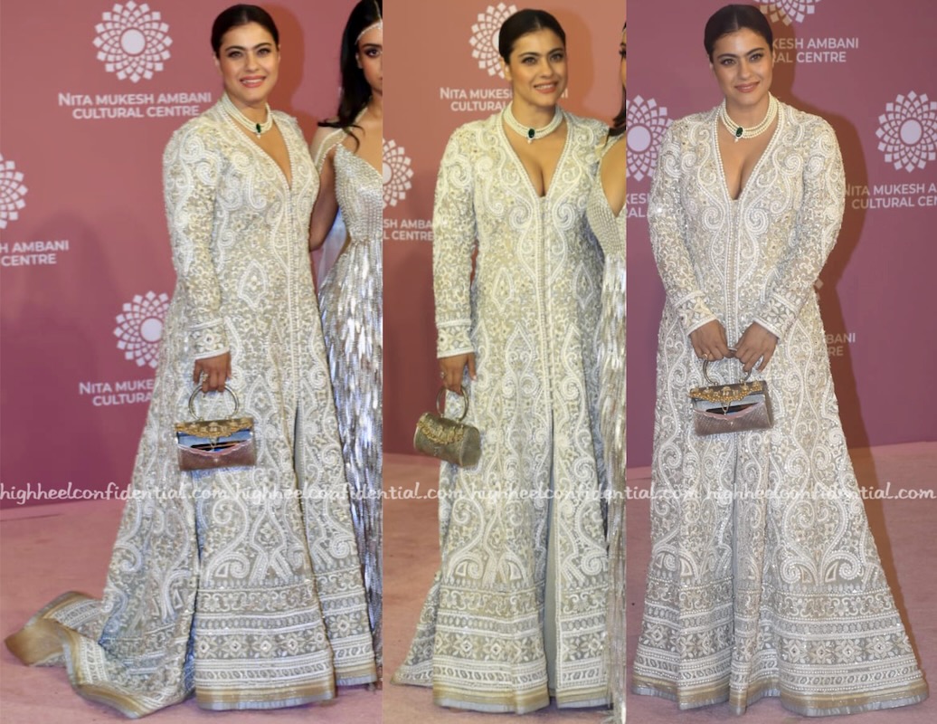 Seeing Kajol in an Abu Jani Sandeep Khosla (instead of the more predictable Manish Malhotra) did come as a surprise. What however wasn’t a surprise was the silhouette/style of the actual outfit itself. And while I don’t think the pearls quite worked with the outfit here, Kajol did look nice.