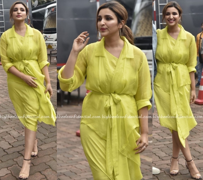 While on the sets of a television show, Karisma was photographed in an embellished Zara Umrigar gown. Ponytail in place, she rounded out the look with a striking lip color and pair of neutral sandals. The vibrant color on her made for a nice change; she wore the look well.