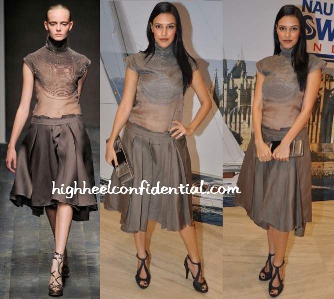 Of all the dresses from the Spring 2010 collection, it is such a downer that Neha picked this one to wear to the Ferragamo cocktail event. She paired her dress with grey sandals and a bow clutch, also Ferragamo. While the color was great, just about everything else was a fail. The hair, the bust fit and the skirt that looked dramatic on the runway falls flat in real life.