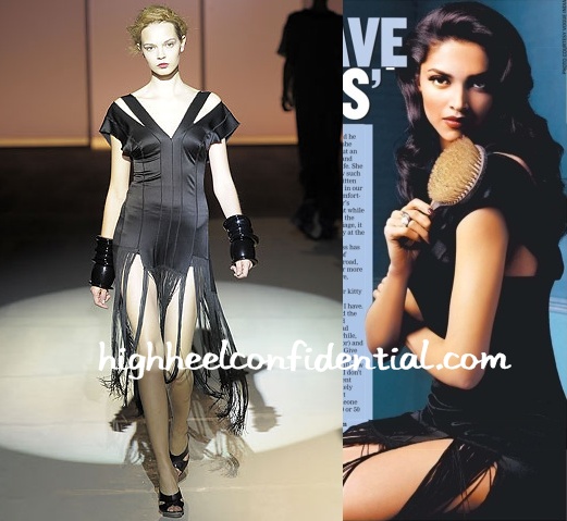 Here is another image of Deepika from the Vogue July Issue wearing a fringed Alberta Ferretti silk dress. Am glad that they shot the picture from the side and the fringe details aren’t as dominant because from the front (as seen on the model) the uneven fringe hemline just looks weird.