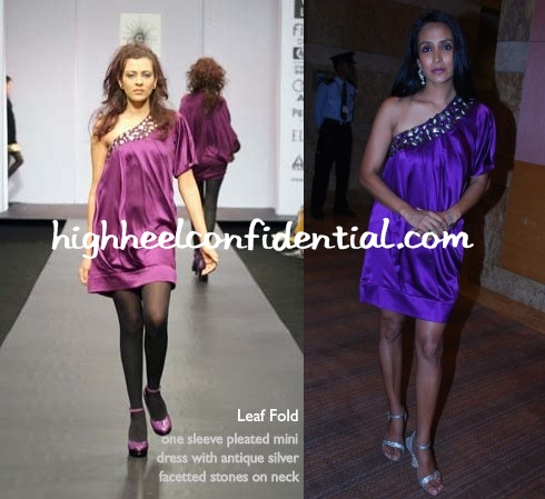 Spotted on Suchitra Pillai, a Gayatri Khanna one-shouldered purple dress from the Autumn 2009 collection. Boy, aren’t we glad she didn’t wear her trademark extra pointy shoes with this dress!