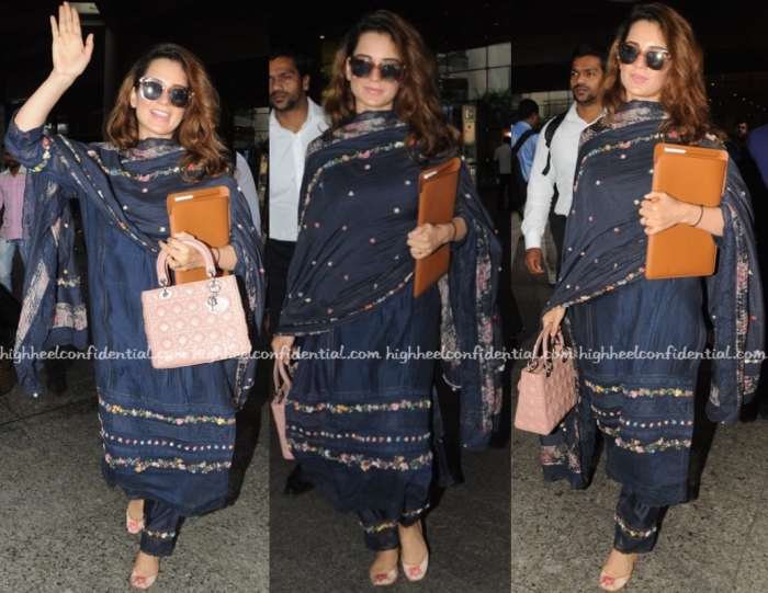 Karisma did monogram by way of her Louis Vuitton tote, and she too picked a pair of round shades to top off the look. The look in question-a Purvi Doshi outfit and pair of easy flats.
