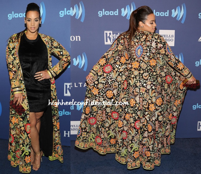Dascha, who stars in Orange Is The New Black, attended the GLAAD Media Awards on Saturday night in NYC wearing a black velvet mini with an Abu Jani Sandeep Khosla long jacket.