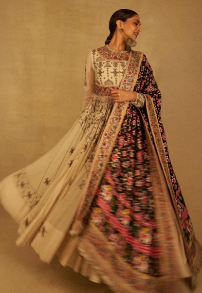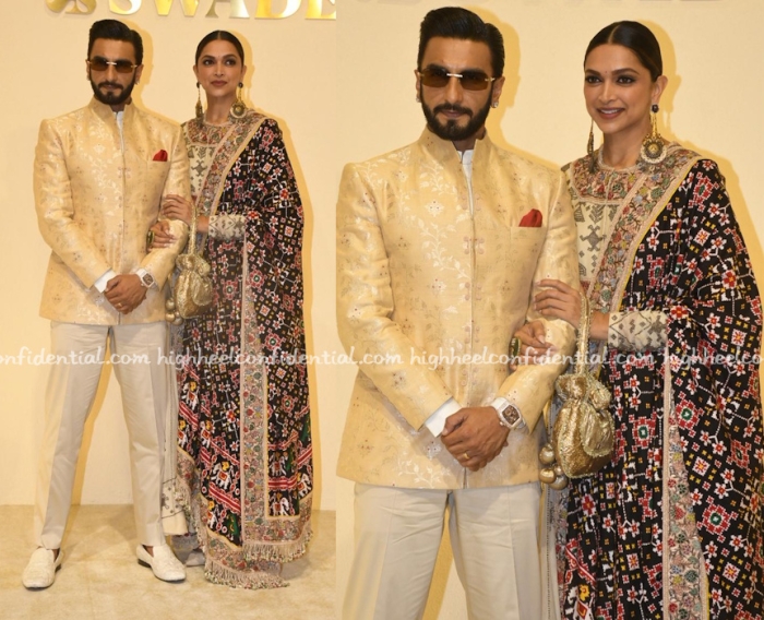 Ranveer and Deepika attended the store launch of Swadesh with Deepika wearing a flared kurta suit by Anamika Khanna. However, the patan patola fabric itself was by artisan Bhawar Singh.