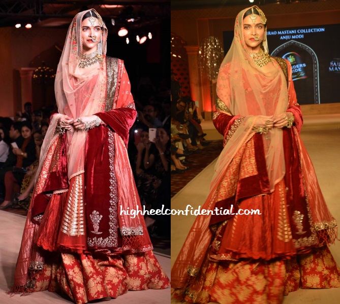 Blender’s Pride Fashion Tour kicked off in Delhi today with a show by Anju Modi. Given that the designer also served as costume designer for the upcoming movie Bajirao Mastani, it made sense to unveil the latest song from the movie featuring Deepika, at the event. No points for guessing who Deepika was wearing. 😛