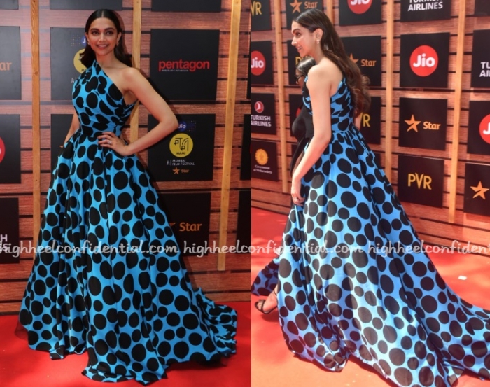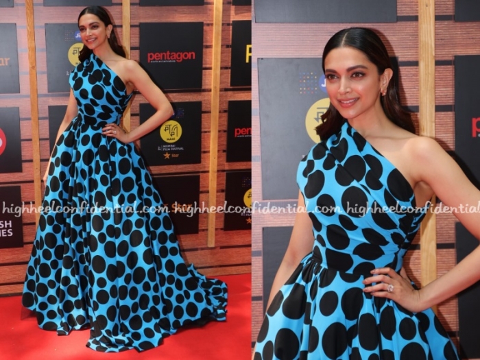 Deepika attended the MAMI Mumbai Film Festival on Sunday wearing a blue polka dotted gown by Marmar Halim. Deepika looked great!