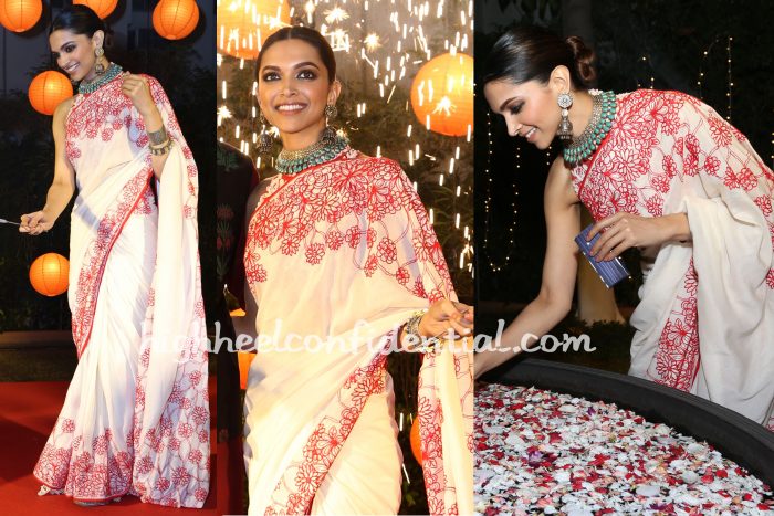 For promotions of Tamasha, Deepika and Ranbir celebrated Diwali with the media where Ms. Padukone was seen in a Payal Jain sari. Now, the sari by itself was so so but this whole look was elevated with the addition of the jewellery (by Aquamarine). Especially the necklace. The turquoise against the red embroidery made the look really pop.