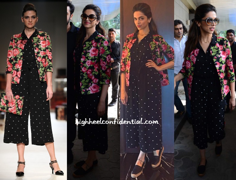 Deepika attended a press screening of Tamasha on Friday wearing a polka dotted jumpsuit and floral jacket, both by Payal Pratap. The length of the jumpsuit felt a bit awkward to me at first glance and now having seen the model version, where it’s more like culottes, I now know why.