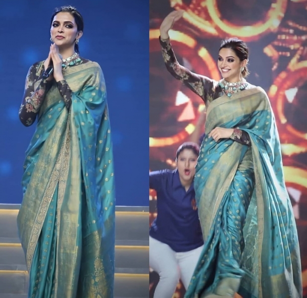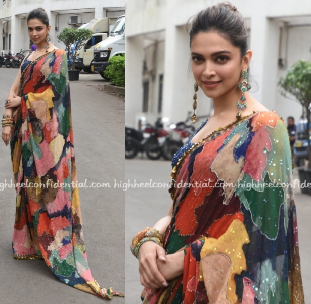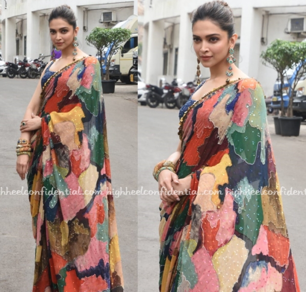 Deepika was seen in two Sabyasachi saris recently, first in a Kanjeevaram paired with a floral full-sleeved blouse and then in a colorful chiffon one paired with a blue sleeveless sequin blouse.
