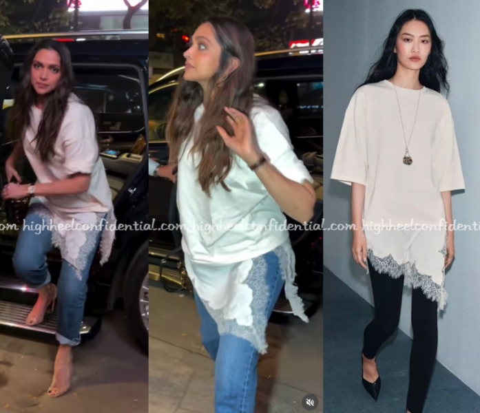 Deepika was spotted on Friday grabbing dinner at a local eatery wearing a Zara asymmetric lace tee with denims and pumps. She sure made it look good.