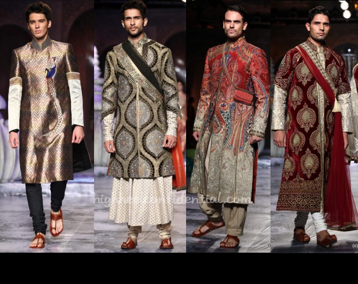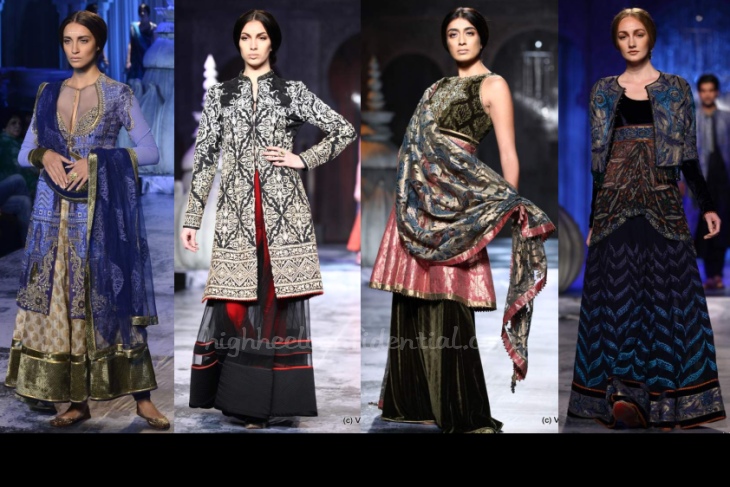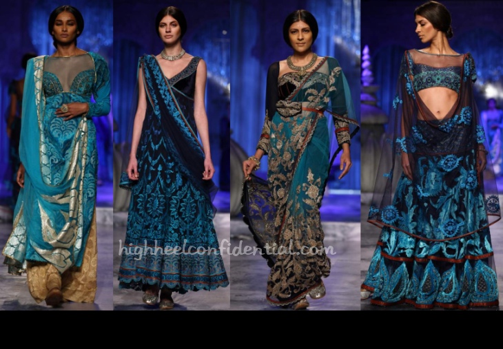 Though it looks same old but upon looking carefully, you can tell it is not. The first Anarkali is so lovely, and the sheer is so subtle. Is it the bird on the sherwani? It’s so unexpected. The blue and brown lenghas are different pallets than what other designers have used so far.