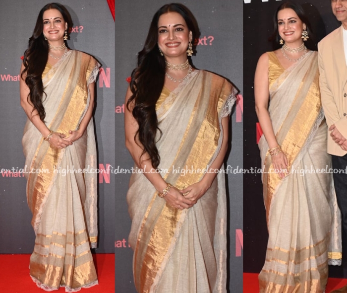 Wearing a gold and cream sari from Anavila, Dia attended the first look event of her upcoming OTT movie. The bronzer/blush seemed a bit heavy handed but other than that she looked nice. Having said that, didn’t quite care for that lace trim on the sari. You like?