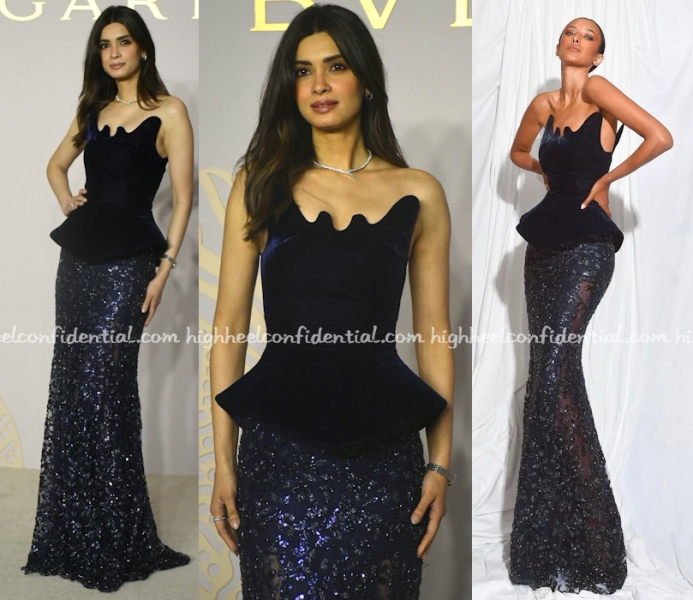 Diana attended opening of an exhibition wearing a strapless blue corset and shimmery sheer skirt set from Lebanese label, Dalida Ayach.