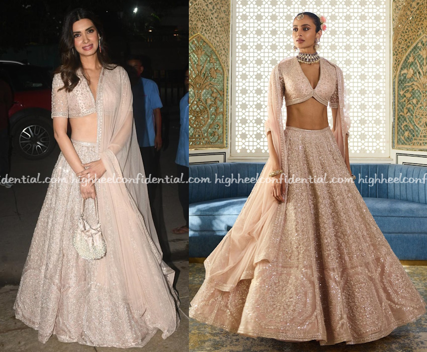 Diana attended a Diwali party on Monday evening wearing a pale pink lehenga from Ridhi Mehra with a matching potli and ruby earrings. She looked nice in it.