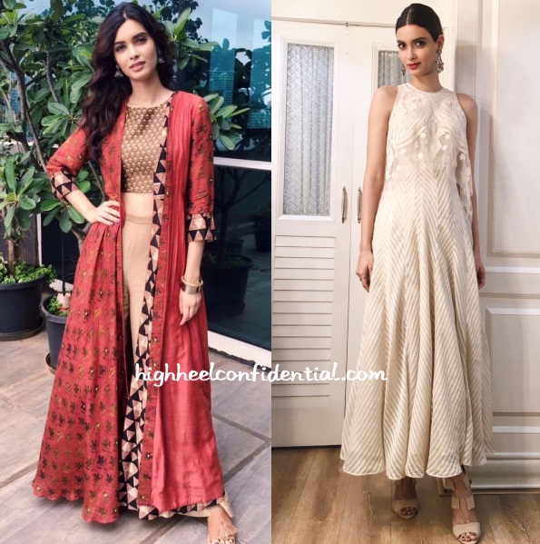 Diana attended more promotions for Happy Bhaag Jayegi this week wearing Label Anushree separates to one and a white Tarun Tahiliani dress to another.