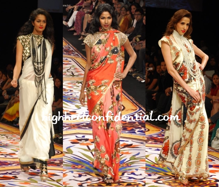 She looked great but that sari isn’t our thing. As awesome as the jewel print looked on the kaftans, on the sari it just was so overwhelming. Loved the more eclectic prints and my favorite was the plain white sari with the border… ironically the least Pria Kataria looking outfit of the collection! 🙂