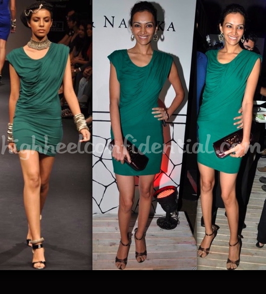 Spotted on Dipannita, a fresh off-the-runway jersey Anita Dongre dress which she paired with some ankle-strap heels and a Louis Vuitton clutch. Love the color on her, wish she picked a different pair o’ heels though.