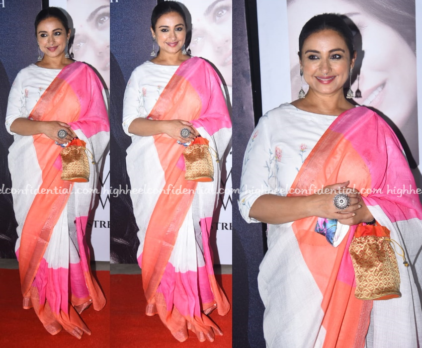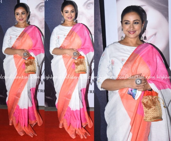 At the screening of a web series, Divya opted for a sari, wearing it with a long-sleeve printed blouse, silver jewellery and a potli. I wish her foundation had been blended better (or am I the only noticing the stark difference?) but other than that she looked lovely.