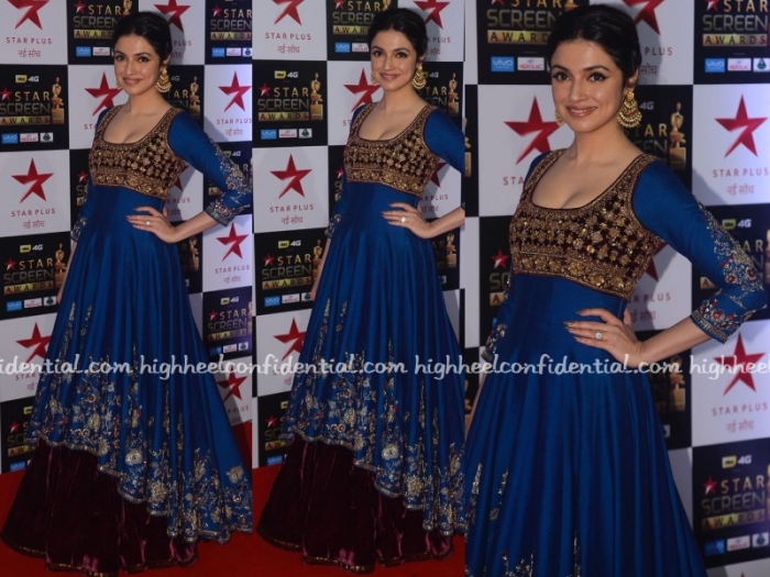 Divya picked an Anju Modi anarkali to wear to the Star Screen Awards on Sunday pairing it with earrings from Anmol. She looked pretty.