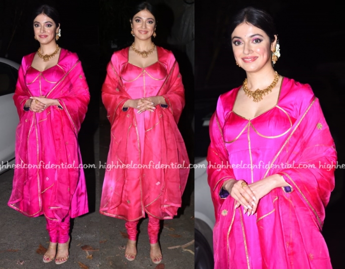 Divya attended the screening of her movie on Wednesday evening wearing a churidaar suit from Raw mango with gold jewellery. She looked nice.