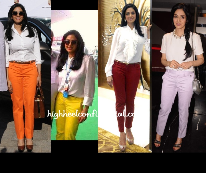 Sridevi’s recent appearance at the Porchse dealership (in the orange pants) reminded us of her past appearances in white blouses and colored pants. The basic combo worked for her on some occasions but not on all, especially not in the maroon pants.
