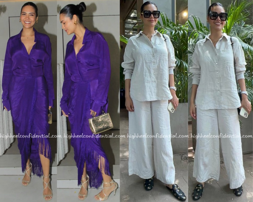 Esha was photographed at two popular Mumbai eateries recently. For an evening out, she teamed her purple dress with metallic accessories. And for a daytime outing, she teamed her matching linen separates with pair of Gucci loafers. A sleek topknot rounded out both of the looks. Like what you see?