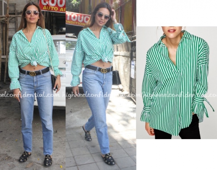 While spotted out and about, Esha was spotted in a Zara striped top knotted at the waist, paired with mom jeans, Gucci belt and mules.