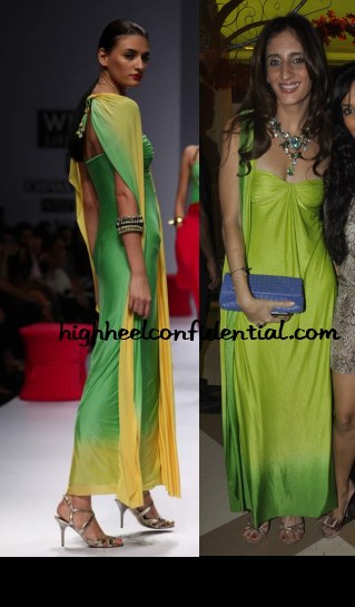 We didn’t have a full length of Farah when we tweeted this pic but here it is. At first, the length of the maxi bothered us but having seen it on the model on the runway, guess we can’t complain it don’t fall right. Love the ombre green combo with the blue Bottega Veneta clutch.