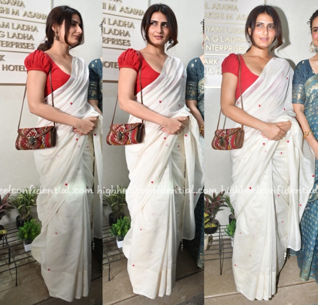 Fatima attended Saraswati Puja celebrations wearing a white sari featuring heart motifs paired with a puff-sleeve blouse and a leather handbag. In theory, this should work but the messy hair distracted a bit.