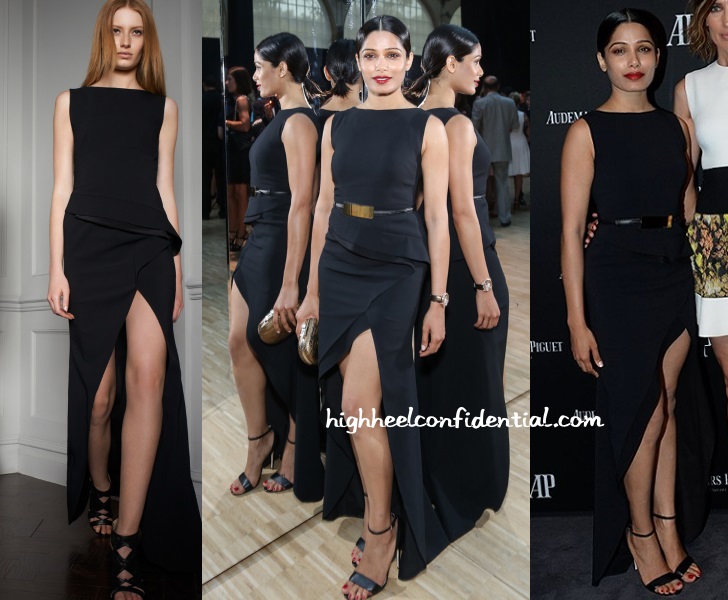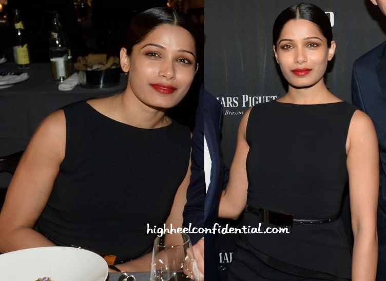 After being announced as the new face of Audemars Piguet, Freida attended a dinner hosted by the luxury Swiss watch brand in Paris. For the formal do, Freida went minimalist in a black Elie Saab gown wearing it with a sleek middle parted ponytail and simple black sandals. The belt addition was a good move as the gown felt a bit bare on its own. If we had a minor gripe, it would be over the make-up. Her face looked ashen in some pics.