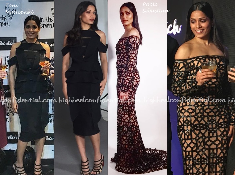 Freida, who has become a brand ambassador for a scotch label, attended a promotional event in Mumbai today wearing a TOME dress with Rupert Sanderson pumps.