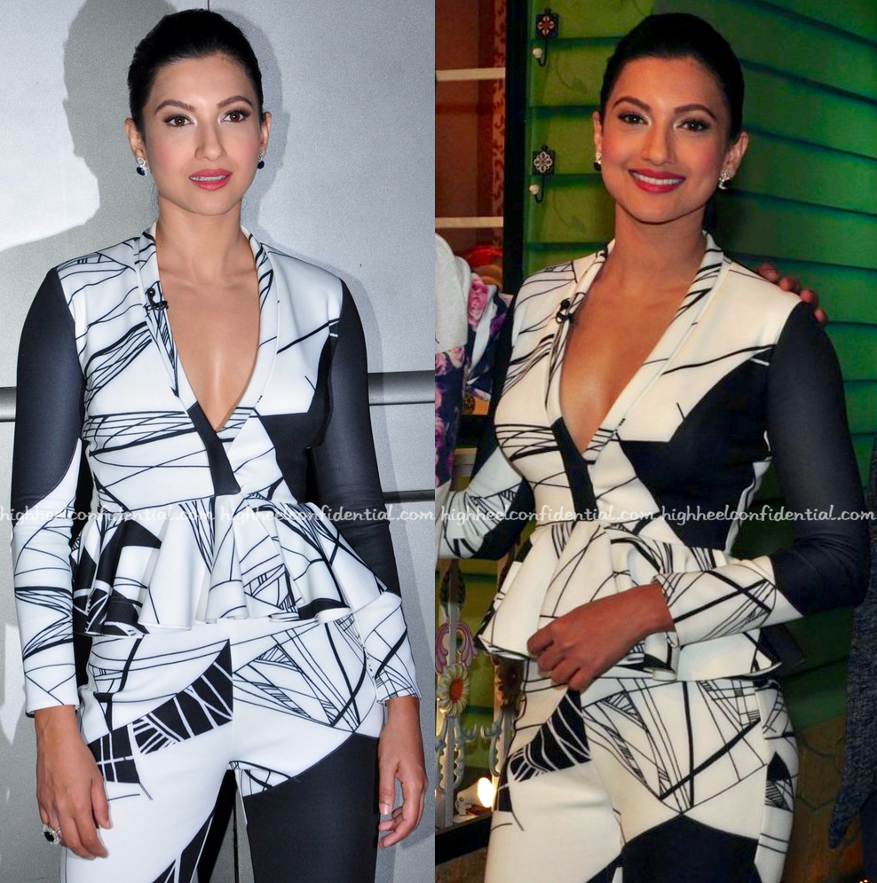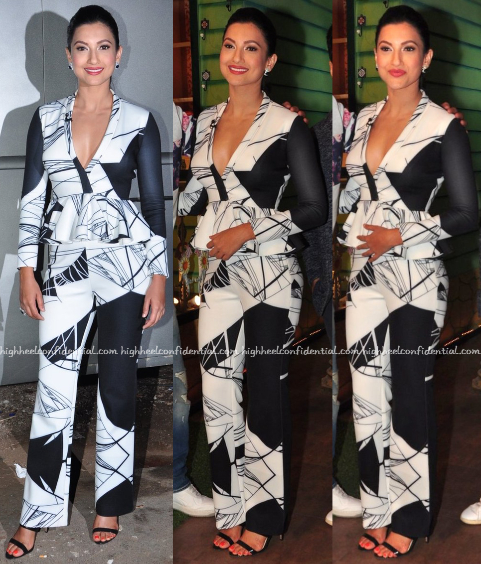 Matching graphic prints, décolletage, peplum and diamond jewelry to boot… A lot to handle but Ms. Khan pulled off her Shivani Awasty suit (paired with Amar Ghanasinghjewelry) better than most others would when on the sets of a television show. Does that mean we like the look? Not quite, it was all a bit much!