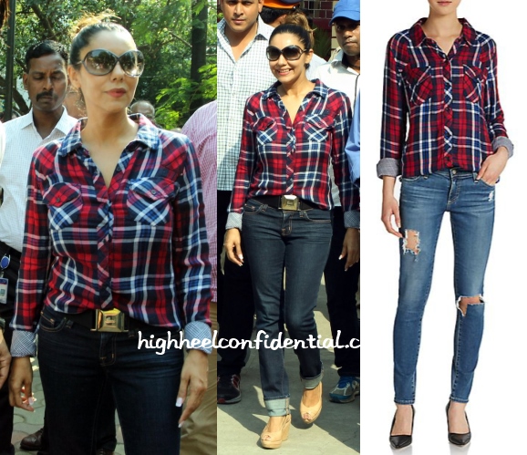 Gauri Khan stepped out to cast her vote wearing denims and a plaid shirt by Rails. With her hair in a top knot, Tom Ford shades, a big buckled belt and nude wedges finished out her look. It doesn’t get more classic than denims and plaid… Like Ms. Khan’s take on it?