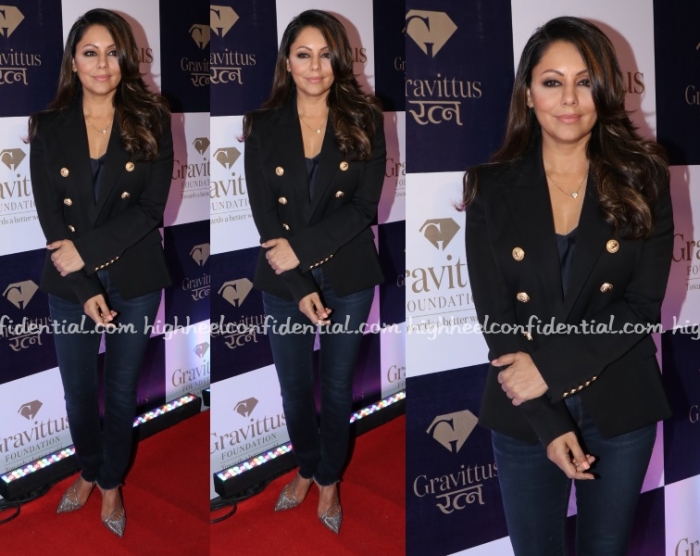 Wearing a Balmain blazer with skinny denims and sparkly Louboutin pumps, Gauri helped unveil a book in Pune on Wednesday. Yes, the concealer stood out a bit but it wasn’t a deal breaker. She looked nice.