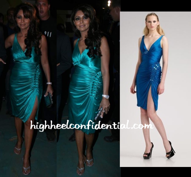 Post the Karan Johar show, Gauri switched into a Fall 2009 Versace dress pairing it with her Chanel clutch and silver slip-ons. I wish we had better pics than the ones taken in the dark because from these, the dress looks bad on Gauri. Also, ff I had my way, I’d ban thong-sandals forever. But, then that’s just me. 😛