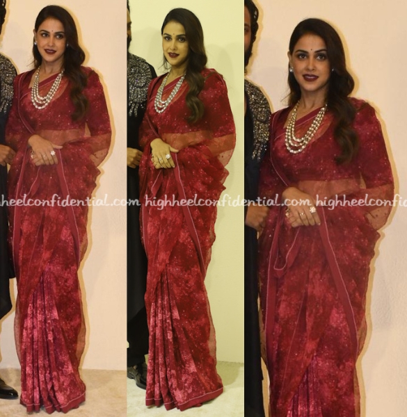 Genelia attended the Swadesh store launch wearing a printed sari from Anavila with a layered polki necklace and studs finished off with a matching deep berry lip. She looked nice in it.