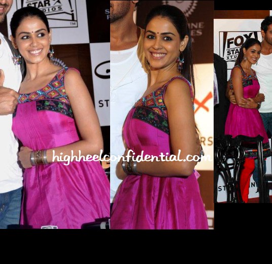 Spotted Ms. D’Souza sporting a hot pink Nishhk outfit. We thought it was a dress Genelia had on until we found a full-length picture and saw the red churidaars. We think they could’ve been given a miss.