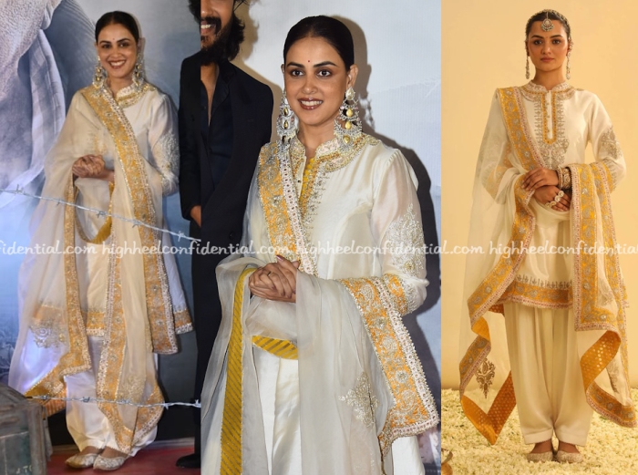 Genelia attended a movie screening wearing a salwar kurta from Sheetal Batra paired with juttis and long earrings. The outfit was nice but I think that dark brown lip color wasn’t the best color to pair with the vibrant suit. Agree? Disagree?
