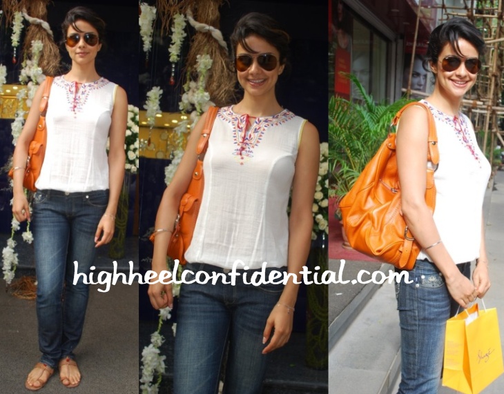 wow! Gul looks impressive. i like the whole look (chic top, jeans, and kolhapuris) but the jeans is a little weird around the ankles. also, that white top seems to have magical powers – it makes even the well endowed Gul look relatively flat chested at least in the 1st and 2nd pic!!!!