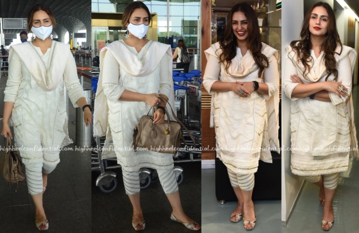 Huma traveled to Delhi to help launch her mom’s salon recently, and for the occasion picked an ivory suit to wear. Pair of jootis, silver jewelry and a striking red lip rounded out the actor’s look.