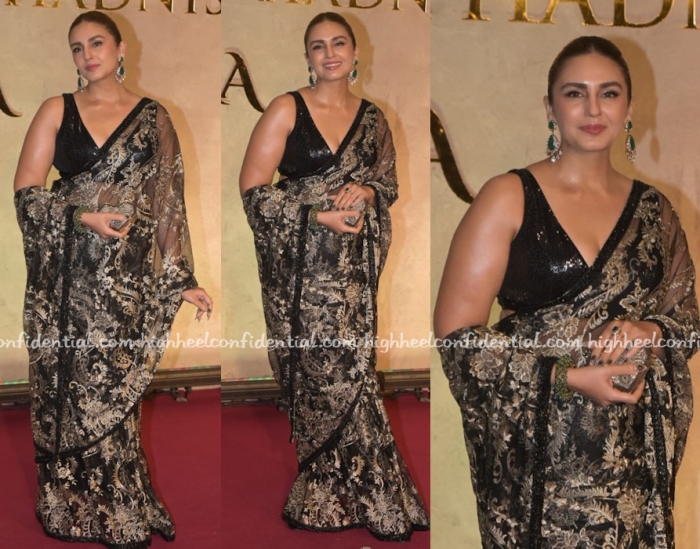 Huma was seen at the Vikram Phadnis show in a sari by the designer featuring a sequin v-neck blouse paired with a heart shaped clutch. She looked nice in it.